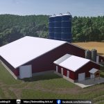 Obora wolnostanowiskowa dla 150 krów. Ta nowoczesna obora wolnostanowiskowa jest zaprojektowana tak, aby pomieścić do 150 krów mlecznych, ma duży dach dwuspadowy, ściany boczne z kurtynami i wentylatory zapewniające optymalny przepływ powietrza.