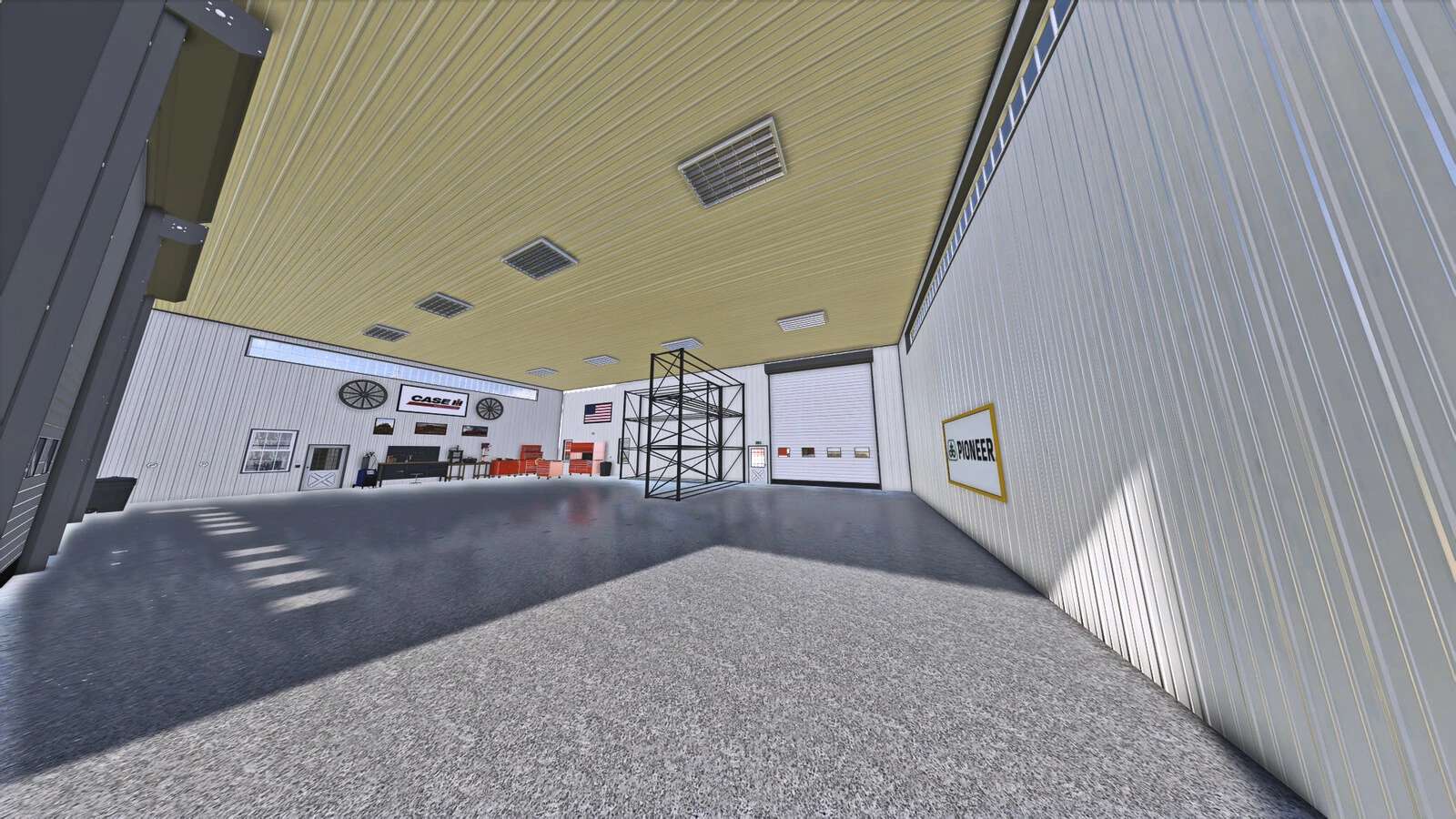 W obszarze roboczym możesz przechowywać plony, maszyny, palety i duże worki na półkach, a także naprawiać, malować, personalizować lub sprzedawać pojazdy.
