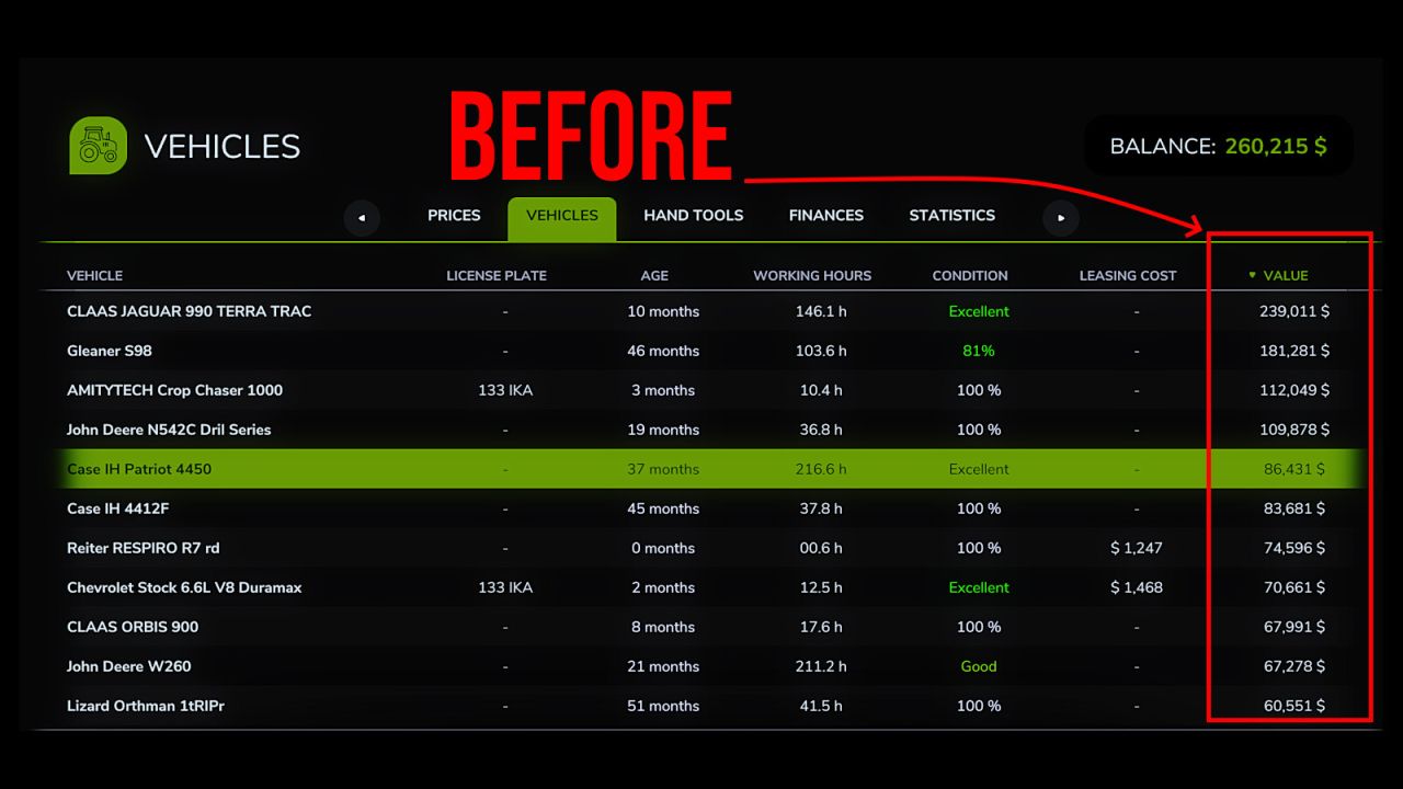 Iron Depreciation wprowadza alternatywny system wartości pojazdów, oparty na rzeczywistych danych z zakresu ekonomii rolnictwa, pochodzących z USDA, Iowa State Extension Service oraz z rejestrów aukcyjnych Machinery Pete. Jeśli preferujesz wartości odsprzedaży, które są bliższe udokumentowanym, rzeczywistym krzywym amortyzacji, ten mod Ci w tym pomoże.