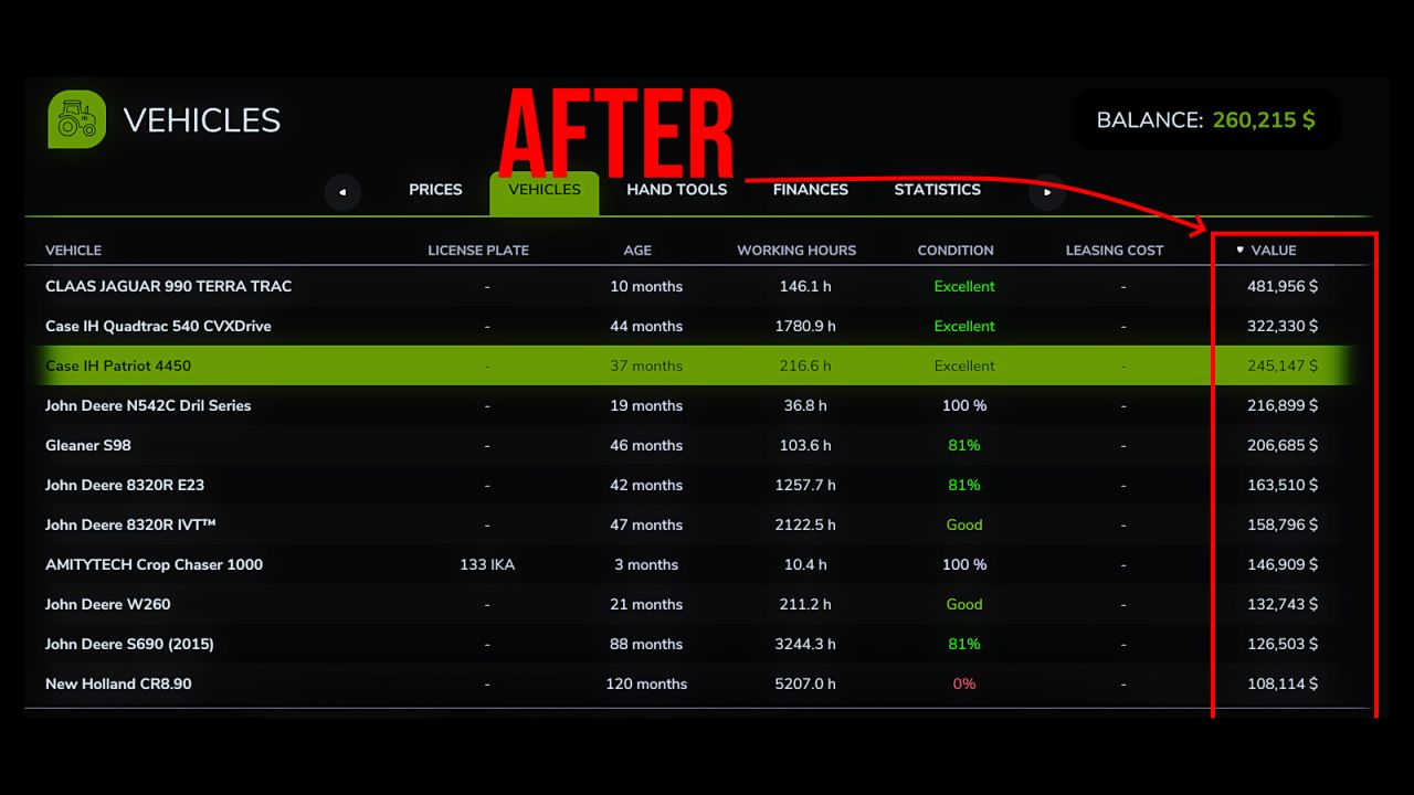 Ten mod dostosowuje koszty ponownego lakierowania do rzeczywistych kosztów profesjonalnego lakierowania. Prawdziwe, profesjonalne, pełne ponowne lakierowanie dużego ciągnika kosztuje 5000-8000 USD – około 2-3% ceny zakupu. Amortyzacja żelaza ogranicza koszty ponownego lakierowania do 4% ceny pojazdu przy maksymalnym zużyciu, skalując je liniowo wraz ze stanem lakieru. Mocno zużyty ciągnik o wartości 300 000 USD kosztuje w tym systemie około 12 000 USD.