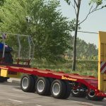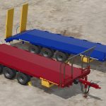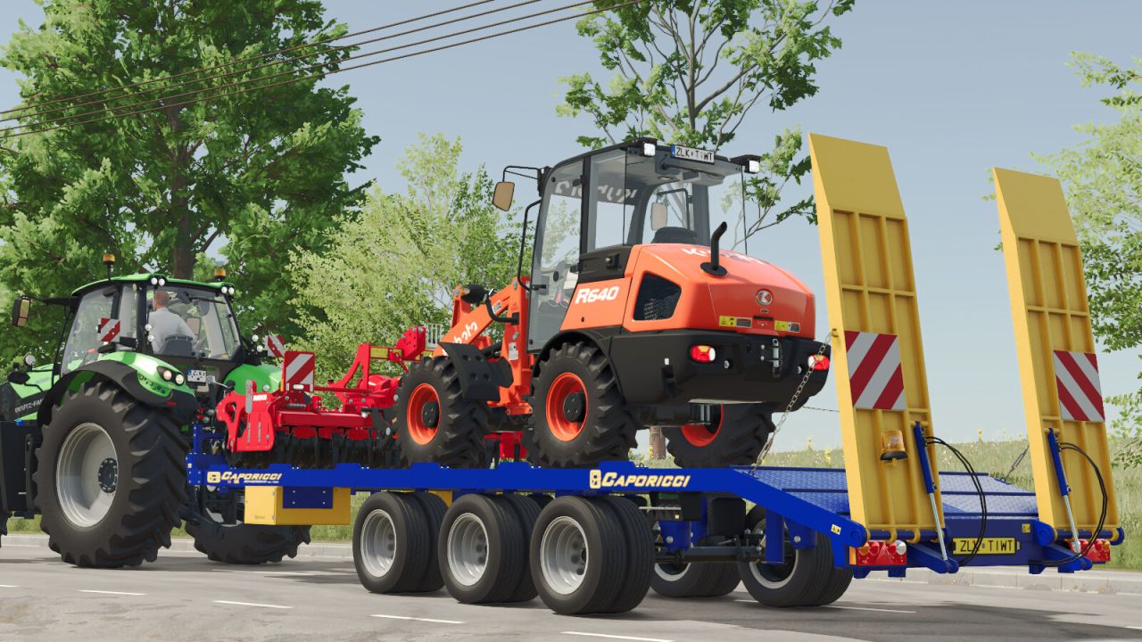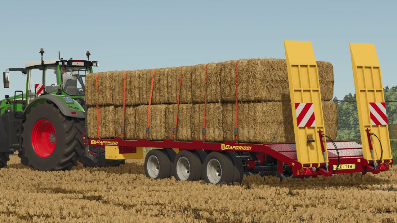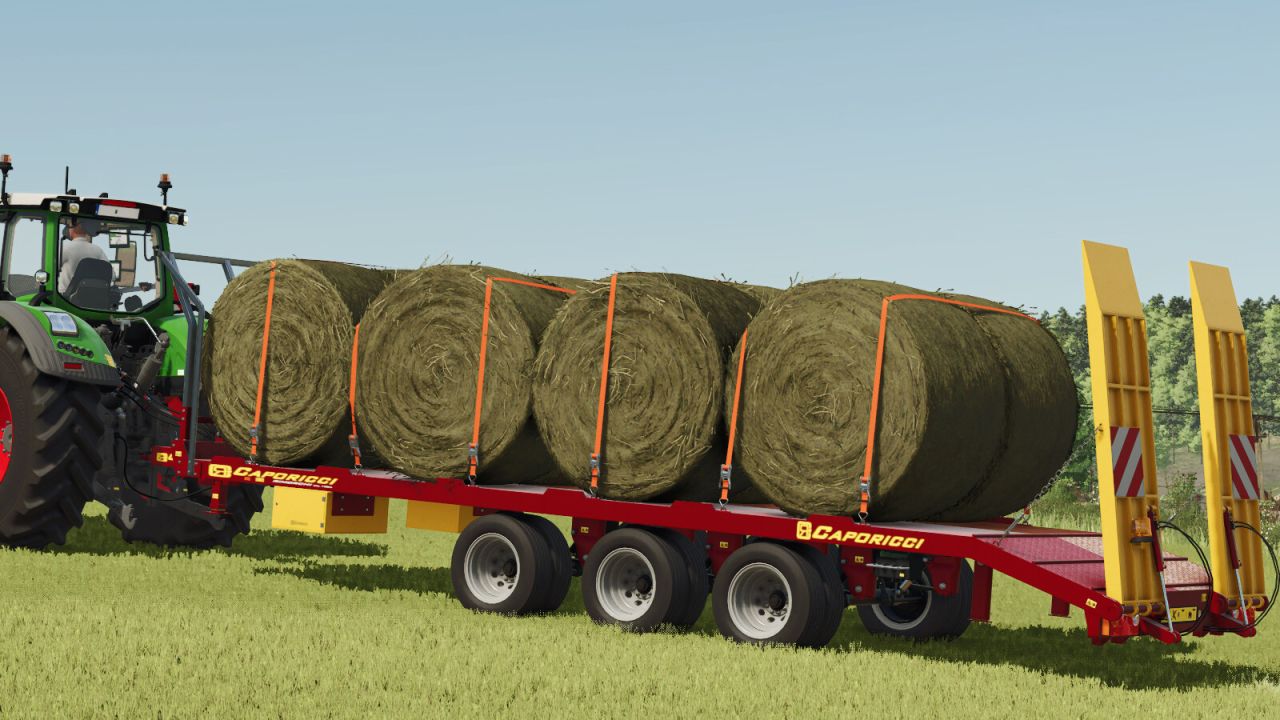Przyczepa Caporicci FC260CR do transportu ciągników gąsienicowych i bel – trzy osie i koła bliźniacze – ładowność całkowita 200 kwintali – waga 5900 kg – długość 9 m – szerokość 2,50 m – możliwość wyboru załadunku automatycznego lub ręcznego.