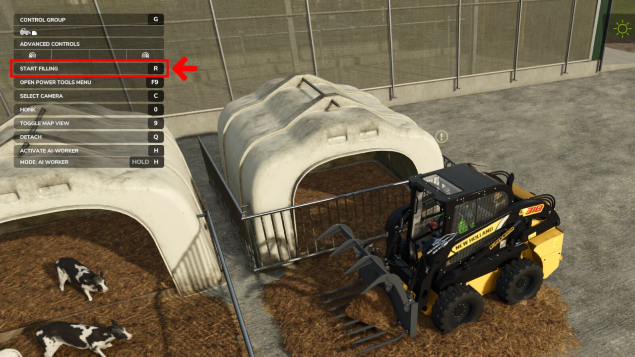 Aby oczyścić zagrodę dla cieląt z obornika, musisz najpierw odsunąć ogrodzenie i ustawić łopatę (lub nawet przyczepę) wewnątrz ogrodzenia, a następnie nacisnąć R – rozpocząć ładowanie (domyślny skrót klawiaturowy – zobacz menu sterowania).