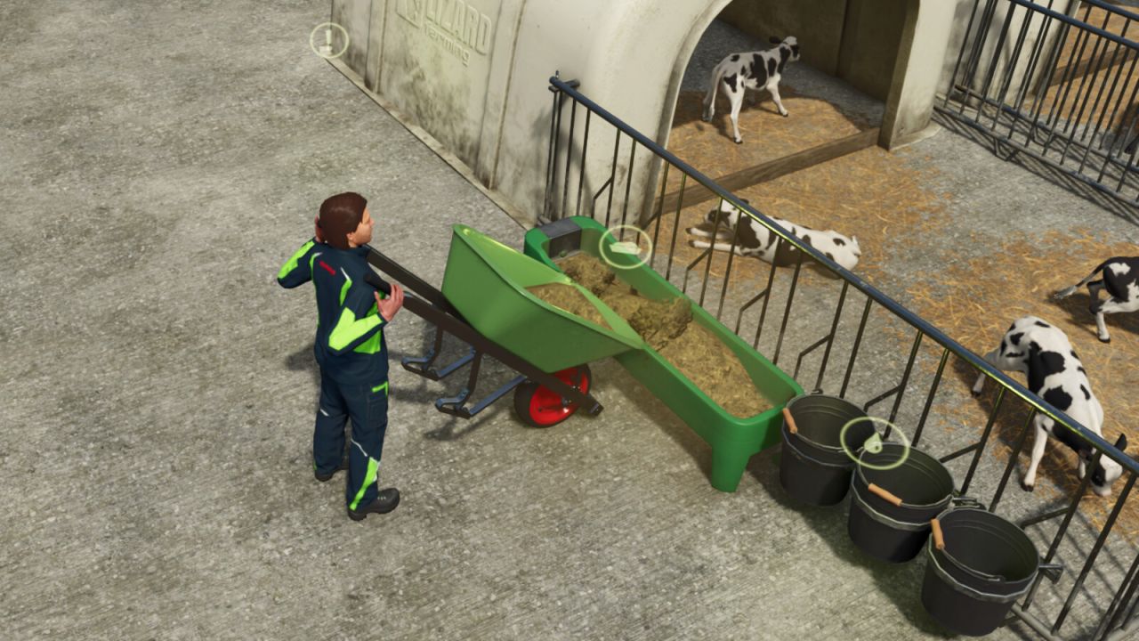 Aby oczyścić zagrodę dla cieląt z obornika, musisz najpierw odsunąć ogrodzenie i ustawić łopatę (lub nawet przyczepę) wewnątrz ogrodzenia, a następnie nacisnąć R – rozpocząć ładowanie (domyślny skrót klawiaturowy – zobacz menu sterowania).