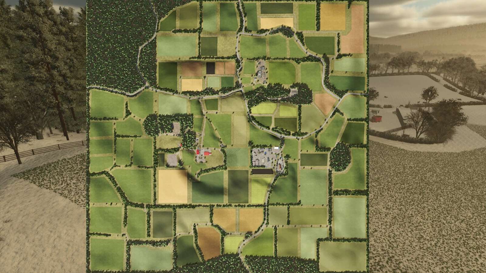 – Dwa czynne gospodarstwa rolne, w tym jedno z silosem zbożowym. Dwa obszary leśne na mapie.