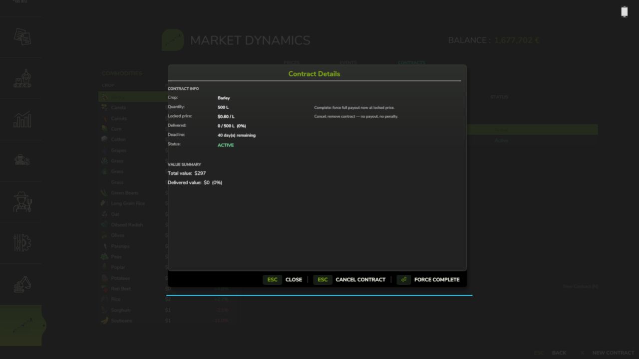 Ekran rynku (F10) — pełna strona InGameMenu z trzema zakładkami: ceny na żywo ze zmianą procentową i wykresem trendów sesji, aktywne wydarzenia na świecie z intensywnością i pozostałym czasem oraz historia kontraktów. Naciśnij N lub kliknij Nowy kontrakt, aby otworzyć okno dialogowe kontraktu z dowolnego miejsca na ekranie.