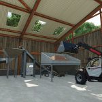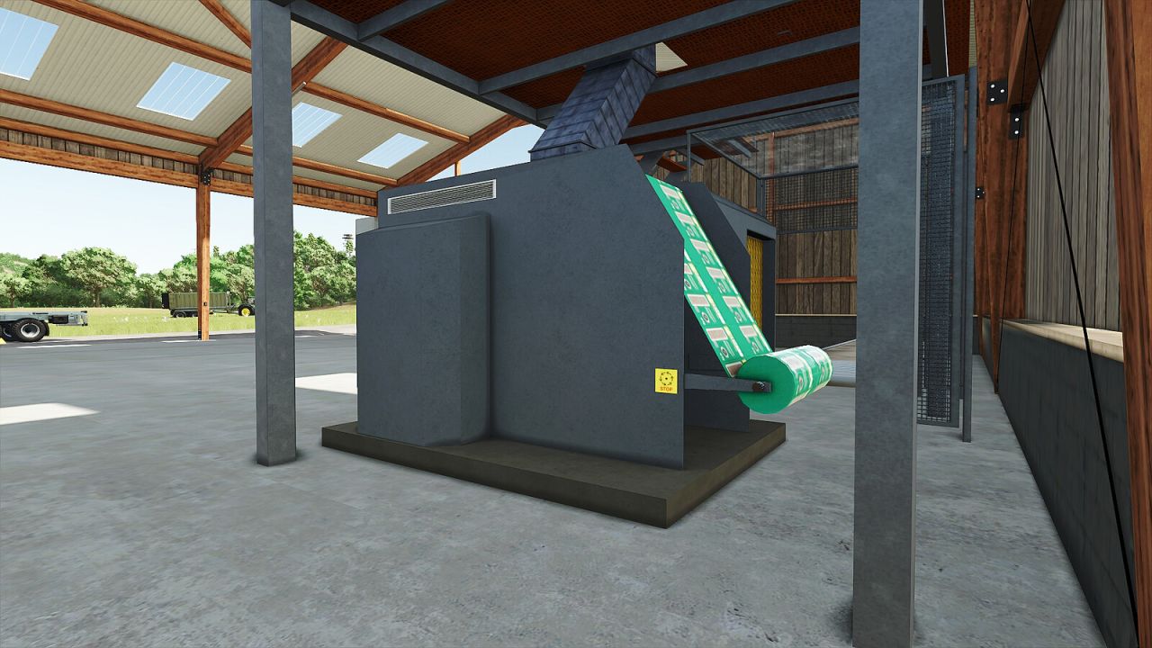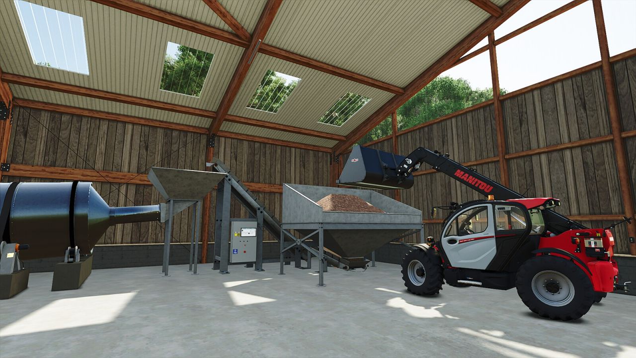 W pełni animowana produkcja peletu drzewnego, ten pelet jest używany do ogrzewania domów lub innych budynków za pomocą kotła lub pieca na pelet. Ten zakład produkcyjny mieści się w 2 drewnianych budynkach o wymiarach 48m x 25m x 10m. Jedna wersja budynku ma 3 drzwi przesuwne, a druga 2 drzwi przesuwne, otwierane z jednej strony.