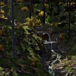 Szczegółowo oddany teren z rzekami, leśnymi ścieżkami i krętymi drogami do transportu drewna.
