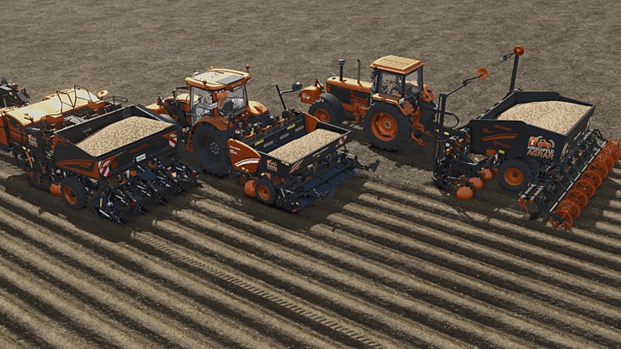 W tym pakiecie maszyn otrzymasz trzy w pełni funkcjonalne sadzarki do ziemniaków Grimme do FS25!