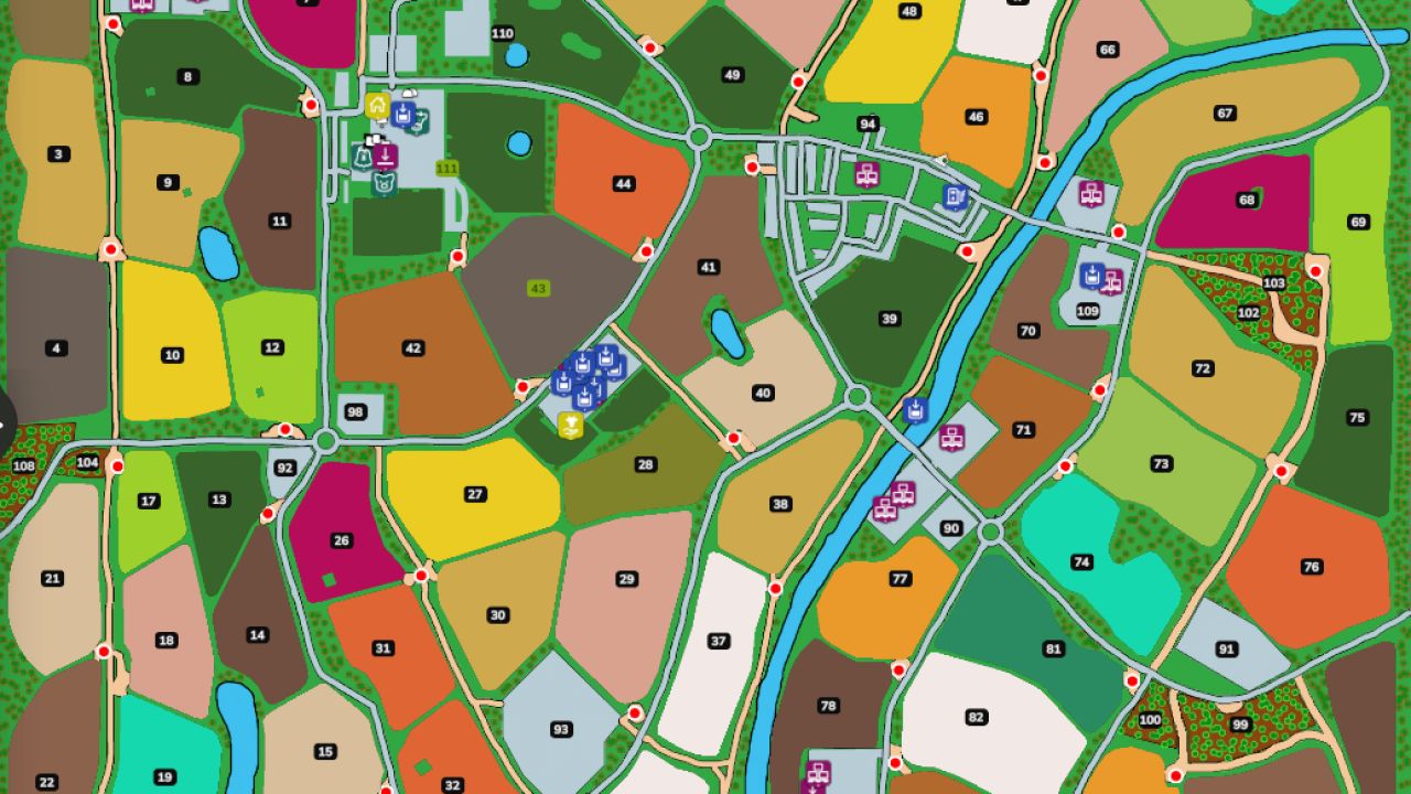 Kilka działek, na których można stworzyć własne farmy lub umieścić fabryki (w sumie 9) (na mapie nie ma żadnych fabryk, zostawiam to Twojej wyobraźni).