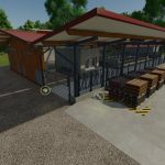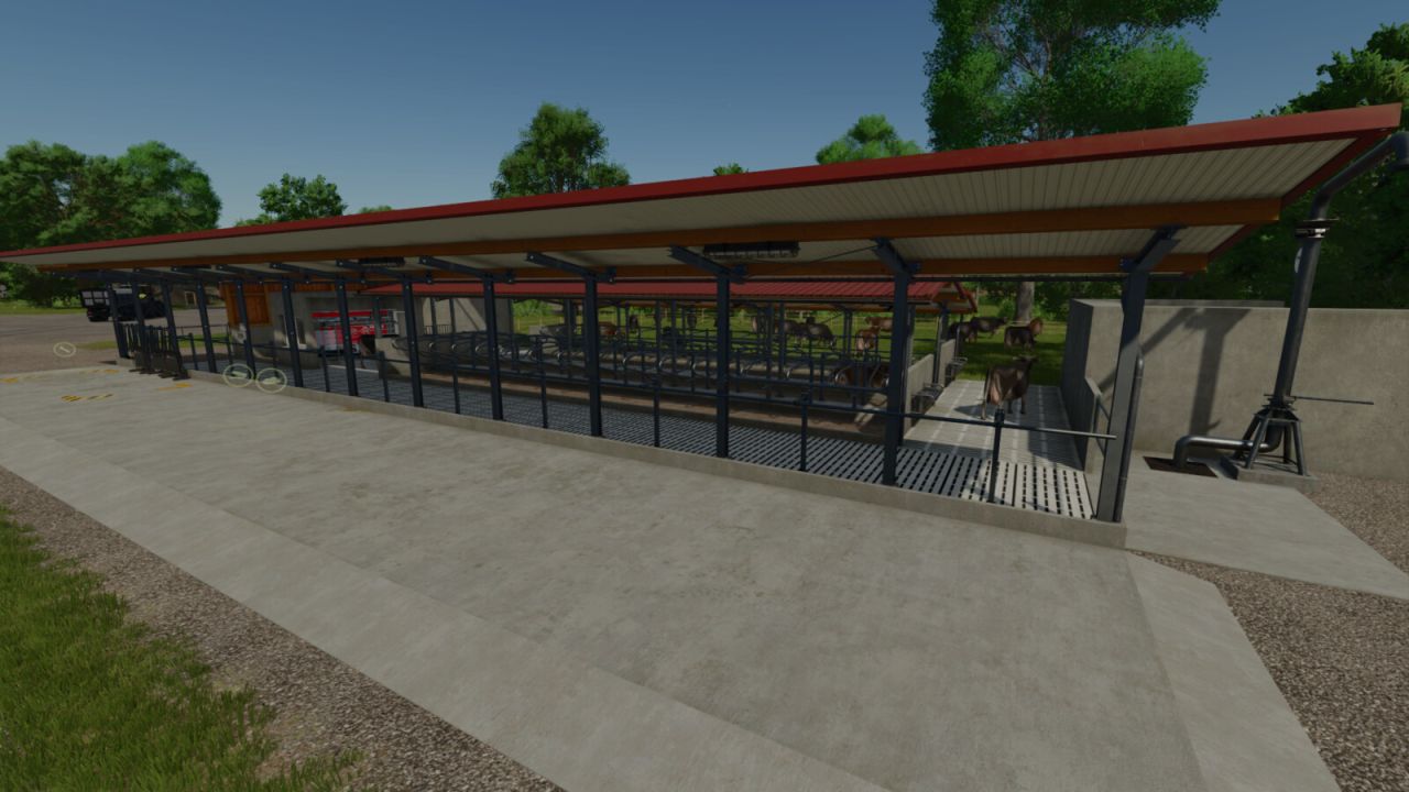 Obora dla krów z wewnętrzną produkcją mleczną i magazynem nawozu. Magazynowanie dla hodowli jest oddzielone od produkcji, więc składniki będą musiały zostać przetransportowane na bardzo krótką odległość, aby wykorzystać je w produkcji. Nawóz jest generowany automatycznie, jeśli dodana zostanie słoma. Zaleca się używanie blokad palet podczas tworzenia przepisów ze składnikami, które mają magazyn, ponieważ palety będą się rozmnażać, chyba że je zablokujesz. Opcje paneli słonecznych z miesięcznym przychodem.