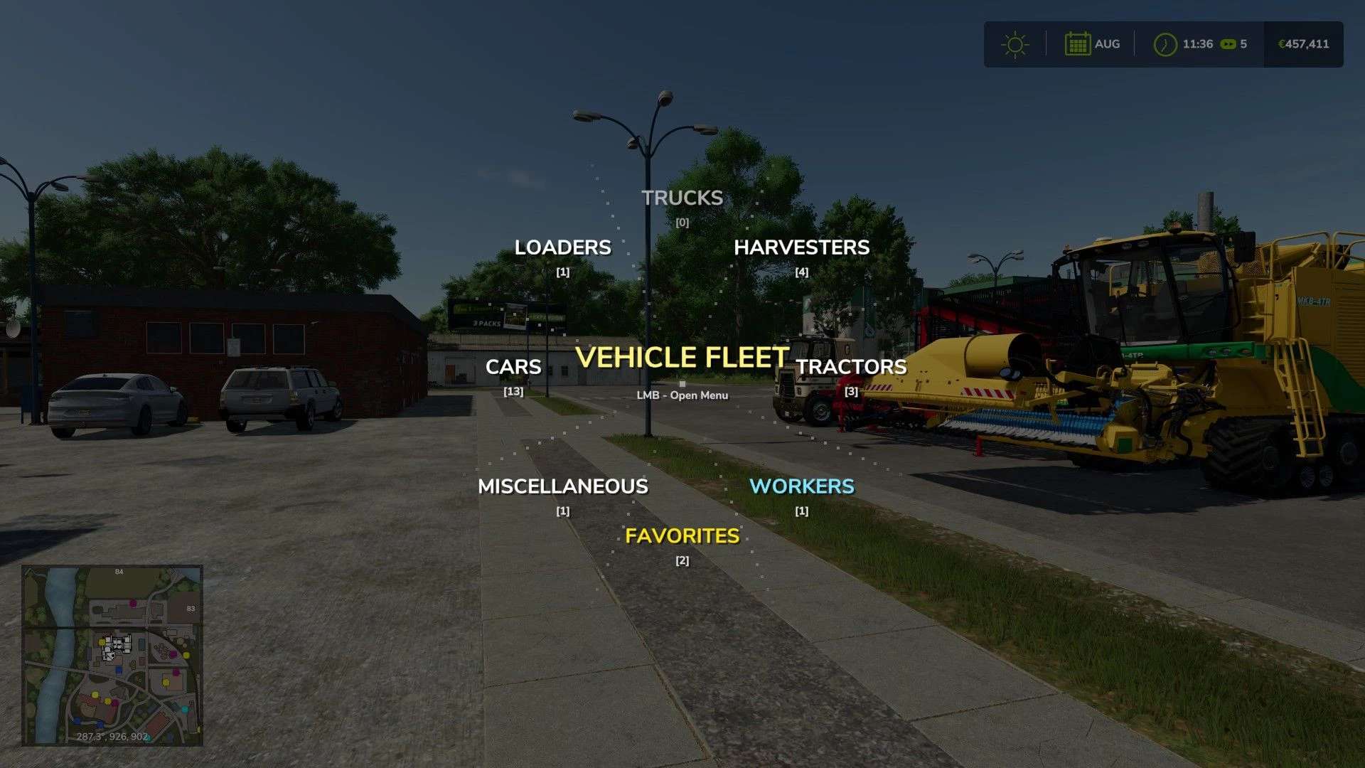 Menu zostało zaprojektowane do zarządzania gospodarstwem w czasie rzeczywistym. Pojazdy obsługiwane przez sztuczną inteligencję (AI) są wyróżnione specjalnym niebieskim wskaźnikiem i pogrupowane w dedykowanej kategorii. W przypadku kombajnów i przyczep menu wyświetla dynamiczne paski poziomu napełnienia, w tym dokładne wartości procentowe i ikony upraw, umożliwiając natychmiastowe monitorowanie stanu floty.