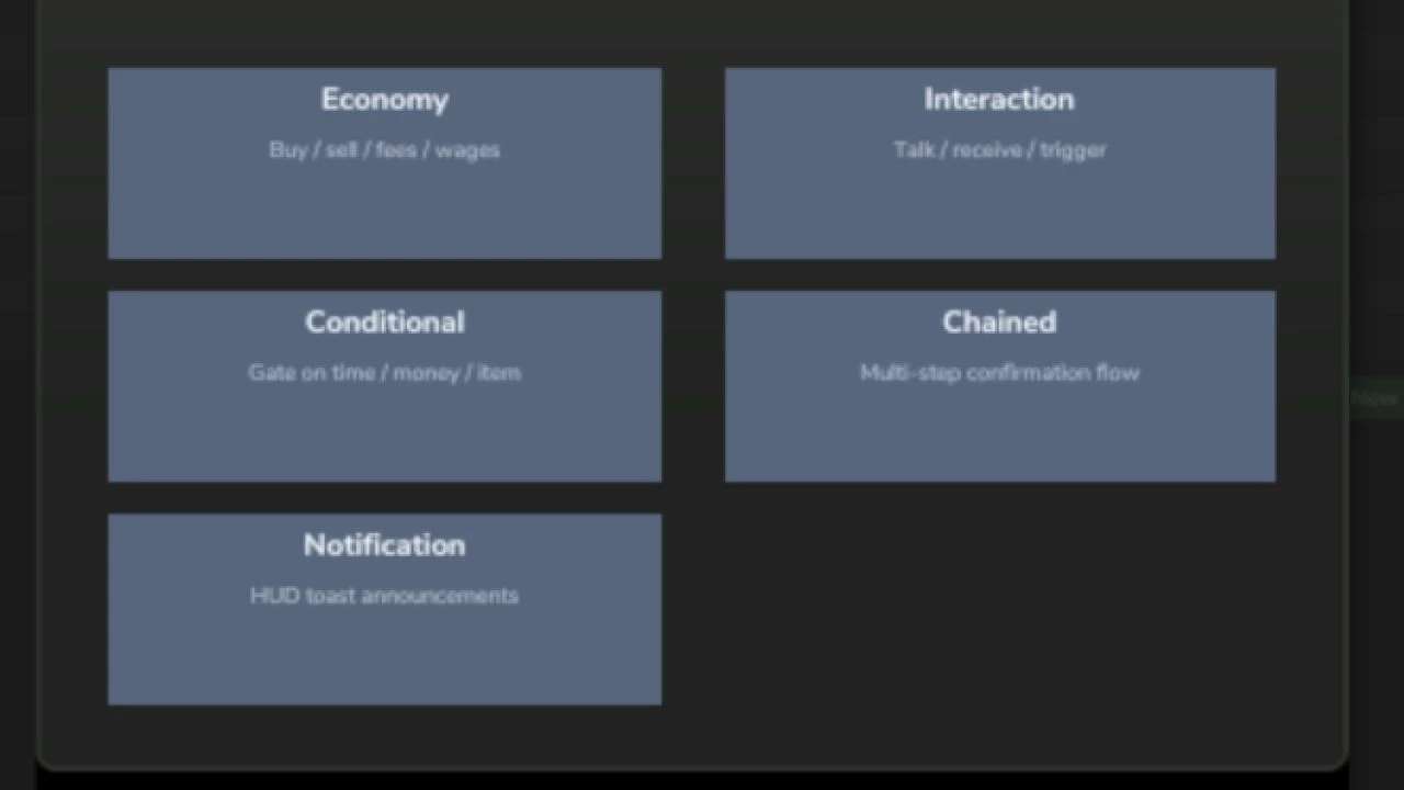 Korzystając z prostego kreatora w grze, możesz tworzyć wyzwalacze dla takich czynności, jak kupowanie lub sprzedawanie przedmiotów, uiszczanie opłat, wyświetlanie powiadomień, uruchamianie wydarzeń lub tworzenie wieloetapowych łańcuchów wyzwalaczy. Wszystko konfiguruje się z prostego menu otwieranego klawiszem F8.