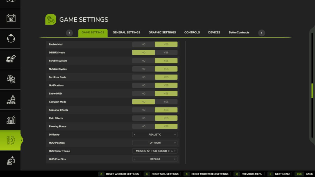 Wszystkie ustawienia znajdują się w menu gry, w sekcji „Gleba i nawóz”. W trybie wieloosobowym ustawienia rozgrywki są kontrolowane przez administratora. Ustawienia HUD/wyświetlania są zawsze indywidualne dla każdego gracza.